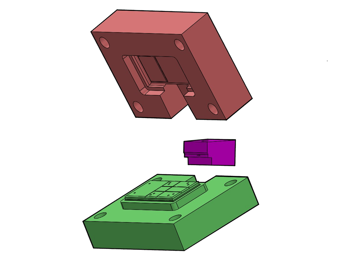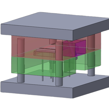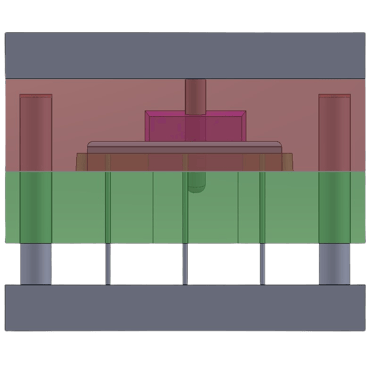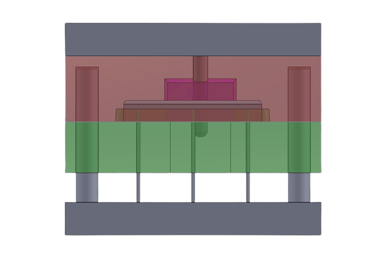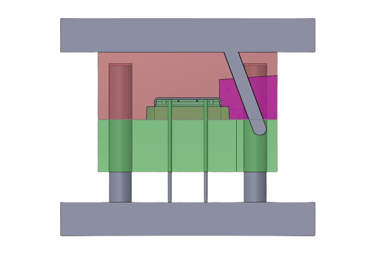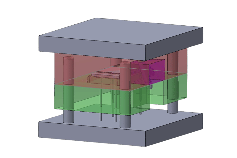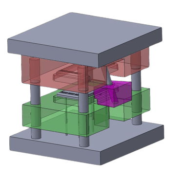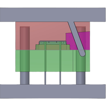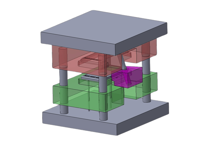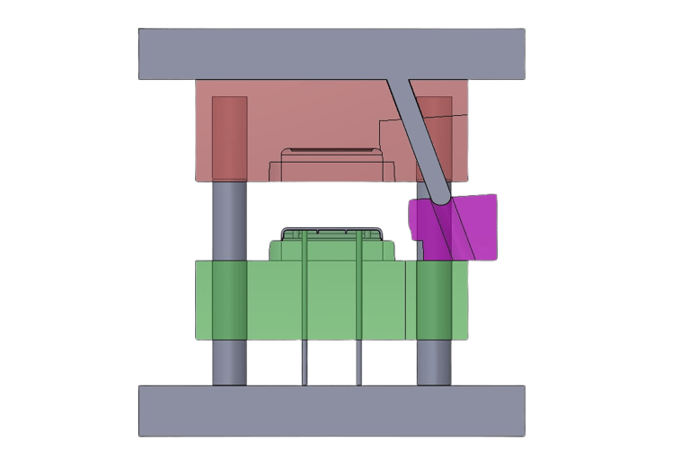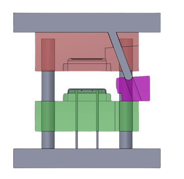 As for the operation of the sideways moving part of the mould, I chose to use a slider that works by means of a pin that moves with the core of the mold, pushing the slider away from the product and then pushing it back together as shown below