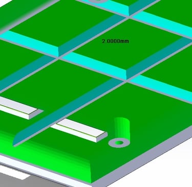 The mould has 4 guide pillars in the corners. I have chosen to use 6 ejectors, for ejectors it is important to make them at least 1mm thicker in diameter than the wall thickness where they will touch the product itself. The product has a universal wall thickness of 2mm, thats why in this case I gave the ejectors a diameter of just under 5mm.